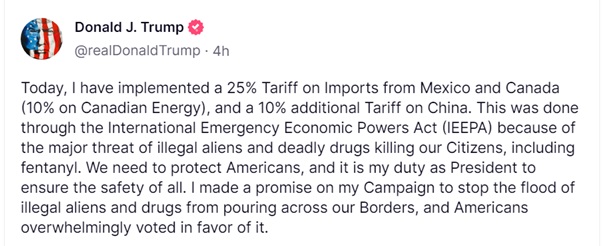 डोनाल्ड ट्रंप ने पोस्ट करते हुए लिखा, "आज मैंने मेक्सिको और कनाडा से आयात पर 25% टैरिफ (कनाडाई ऊर्जा पर 10%) और चीन पर 10% अतिरिक्त टैरिफ लागू किया है। यह IEEPA के माध्यम से किया गया था क्योंकि अवैध विदेशियों और घातक दवाओं के कारण हमारे नागरिकों की मृत्यु का बड़ा खतरा है।"