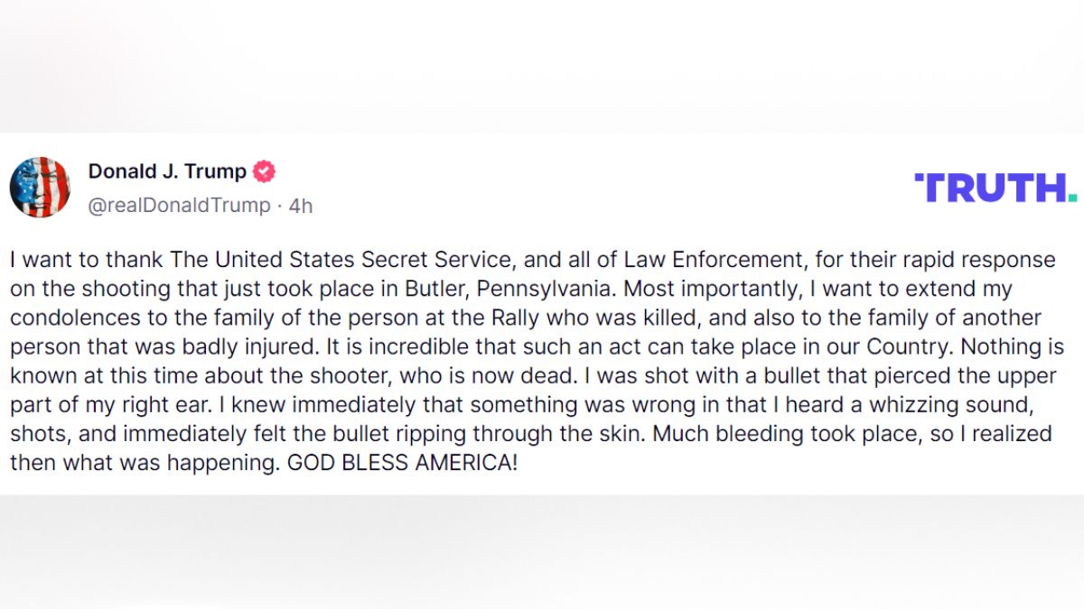 उन्होंने ट्रूथ पर लिखा, "मैं पेंसिल्वेनिया के बटलर में हुई गोलीबारी पर जल्दी प्रतिक्रिया देने के लिए यूनाइटेड स्टेट्स सीक्रेट सर्विस और सभी लॉ एंफोर्समेंट एजेंसियों को धन्यवाद देना चाहता हूं। सबसे महत्वपूर्ण, मैं रैली में मारे गए शख्स के परिवार और बुरी तरह घायल हुए एक अन्य शख्स के परिवार के प्रति अपनी संवेदना जताता हूं। यह अविश्वसनीय है कि ऐसा कृत्य हमारे देश में भी हो सकता है। इस समय हमलावर के बारे में कुछ भी पता नहीं है, वह अब मर चुका है।"