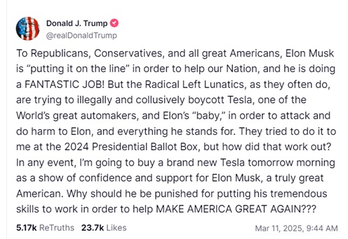 सोशल मीडिया पर पोस्ट करते हुए राष्ट्रपति ट्रंप ने लिखा, "एलन मस्क हमारे राष्ट्र की मदद करने के लिए अपनी जान जोखिम में डाल रहे हैं और वह एक शानदार काम कर रहे हैं! लेकिन कट्टरपंथी वामपंथी एलन मस्क की कंपनी टेस्ला का बायकॉट कर रहे हैं ताकि उन्हें नुकसान पहुंचाया जा सके। उन्होंने 2024 चुनाव में मुझे रोकने की कोशिश की, लेकिन ऐसा नहीं हो सका। कुछ भी हो मैं कल सुबह एलन मस्क, एक सच्चे महान अमेरिकी के लिए विश्वास और समर्थन दिखाने के लिए एक नई टेस्ला खरीदने जा रहा हूं।"