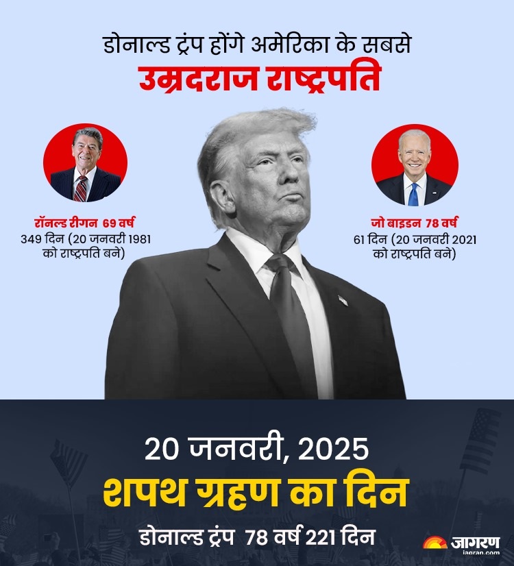 ट्रंप, राष्ट्रपति पद की शपथ लेने वाले अमेरिका के इतिहास के सबसे बुजुर्ग राष्ट्रपति होंगे। दरअसल, 20 जनवरी को जब ट्रंप राष्ट्रपति पद की शपथ लेंगे तो उनकी उम्र 78 साल 221 दिन होगी।