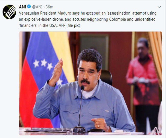 ड्रोन हमले की पुष्टि करते हुए वेनेजुएला के सूचना मंत्री जॉर्ज रोड्रिग्ज ने बताया, 'मादुरो को निशाना बनाते हुए ड्रोन से हमला किया गया। हमला उस वक्त हुआ जब मादुरो राजधानी कराकस में सैंकड़ो सिपाहियों को संबोधित कर रहे थे। हालांकि राष्ट्रपति को कोई नुकसान नहीं पहुंचा है।'