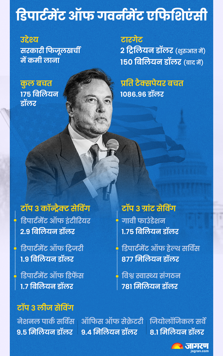 - सरकारी दक्षता विभाग की जिम्मेदारी फिजूलखर्ची को कम करना था। ट्रंप के चुनावी वादे टैक्सपेयर का पैसा बचाने पर केंद्रित थे। चुनावी जुमलों से इतर, जब डीओजीई अस्तित्व में आया, तो टारगेट 2 ट्रिलियन डॉलर की सेविंग का रखा गया था। लेकिन समय के साथ इसे घटाकर 1 ट्रिलियन डॉलर कर दिया गया।