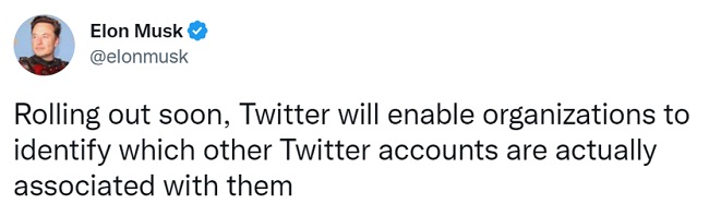इस बीच एलन मस्क ने सब्सक्रिप्शन प्रोग्राम को लेकर अहम जानकारी दी है। एलन मस्क ने ट्वीट कर बताया कि जल्द ही ट्विटर यह पहचानने में सक्षम करेगा कि कौन से अन्य ट्विटर अकाउंट वास्तव में उनसे जुड़े हुए हैं।
