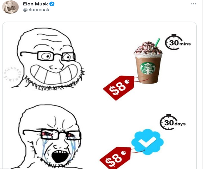 दोनों ही तस्वीर के साथ एक इमोजी भी मौजूद है। पहली तस्वीर में शख्स कॉफी के रेट देखकर खुश नजर आ रहा है। जबकि दूसरी तस्वीर में शख्स ब्लू टिक की कीमत देखने के बाद रो रहा है। एलन मस्क ने इस तस्वीर के माध्यम से उन लोगों पर तंज कसा है। जिन्होंने ब्लू टिक के लिए 8 डॉलर चुकाने के फैसले पर सवाल उठाए थे।