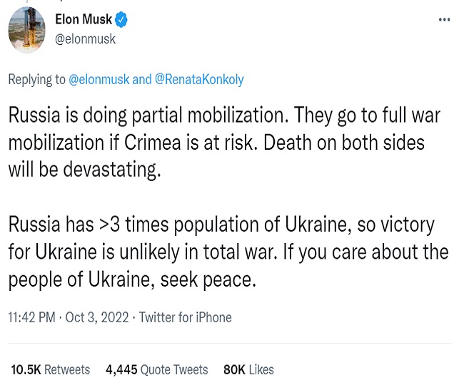मस्क ने एक और ट्वीट किया और कहा, 'रूस आंशिक तौर पर लामबंदी कर रहा है। अगर क्रीमिया खतरे में पड़ता है तो रूस पूरी तरह से लामबंदी कर लेगा। दोनों तरफ ही मौत होगी। रूस की आबादी यूक्रेन से 3 गुना अधिक है। इसलीए इस युद्ध को यूक्रेन का जीतना संभव नहीं है। अगर आप यूक्रेन के लोगों की परवाह करते हैं, तो शांति की तलाश कीजिए।'