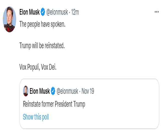 माइक्रोब्लागिंग वेबसाइट के नए CEO एलन मस्क ने शुक्रवार को अमेरिका के पूर्व राष्ट्रपति डोनाल्ड ट्रंप के ट्विटर अकाउंट को दोबारा बहाल करने को लेकर एक poll डाला है, जो 24 घंटे तक रहेगा।