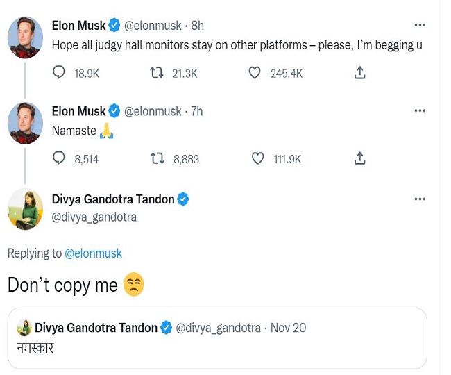 भारतीय उद्यमी दिव्या टंडन ने मस्क पर ट्वीट को कॉपी करने का आरोप लगाया है। उन्होंने कहा, मेरी ट्वीट को कॉपी मत कीजिए।