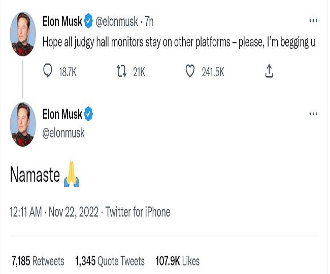 इस ट्वीट से पहले मस्क ने लोगों से ट्विटर पर बने रहने की प्रार्थना की थी। उन्होंने कहा था, 'आशा है कि सभी जजी हॉल मॉनिटर अन्य प्लेटफार्मों पर बने रहेंगे। कृपया, मैं आपसे भीख मांग रहा हूं।'
