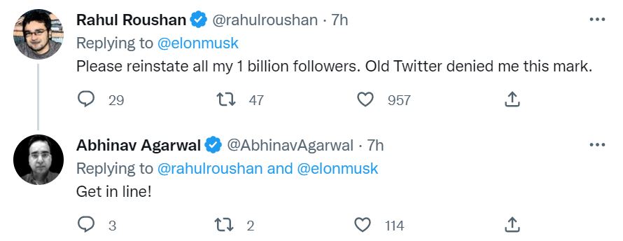 एक यूजर ने कहा- मुझे लगता है कि वह सिर्फ भारत से व्यापार चाहता है, बड़े बाजार अपने टेस्ला को बेचने के लिए .. !! इससे ज़्यादा कुछ नहीं ..!! एक अन्य यूजर्स ने कहा- नमस्ते, जय बजरंग बली, जय श्री राम। वहीं, राहुल रोशन ने मस्क से मांग की, 'कृपया मेरे सभी 1 बिलियन फॉलोअर्स को बहाल करें। पुराने ट्विटर ने मुझे इस निशान से वंचित कर दिया।' इस पर जवाब देते हुए अभिनव अग्रवाल ने कहा- लाइन में लगे रहें!