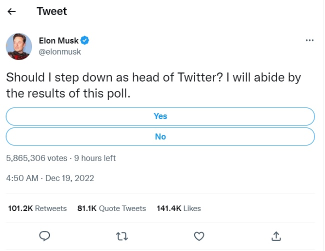 मस्क ने एक ट्वीट में लोगों से एक पोल में भाग लेने के लिए कहा। मस्क ने पोल के जरिए लोगों से पूछा है कि क्या उन्हें ट्विटर के प्रमुख के पद से इस्तीफा दे देना चाहिए? मस्क ने इसी के साथ पोल के नतीजों का पालन करने की भी बात कही है।