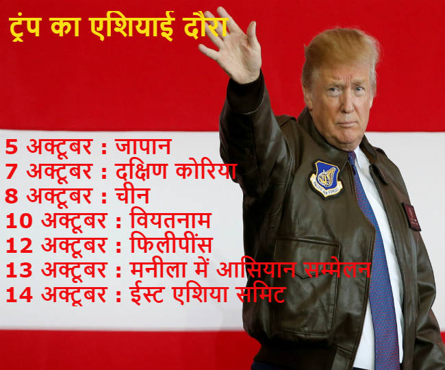 1992 के बाद कोई अमेरिकी राष्ट्रपति इतने दिनों के लिए एशियाई दौरे पर निकला है। ट्रंप से पहले पूर्व राष्ट्रपति जॉर्ज डब्ल्यू बुश ने एशिया का 12 दिवसीय दौरा किया था। बहरहाल, उनके इस दौरे में उत्तर कोरिया और व्यापार दोनों ही एजेंडा शीर्ष पर है। जापान के बाद 7 अक्टूबर को ट्रंप दक्षिण कोरिया, 8 अक्टूबर को चीन, 10 अक्टूबर को वियतनाम और 12 अक्टूबर को फिलीपींस पहुंचेंगे। ट्रंप के साथ इस दौरे में कुछ बड़ी कंपनियों के सीईओ भी हिस्सा ले रहे हैं। 13 अक्टूबर को वह मनीला में आसियान सम्मेलन में हिस्सा लेंगे। 14 अक्टूबर को वह ईस्ट एशिया समिट में भाग लेंगे। इसमें भारत समेत अमेरिका और रूस भी हिस्सा लेंगे।