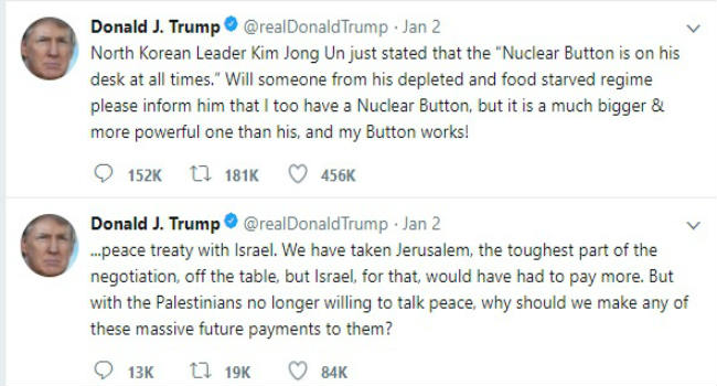 दो दिन बाद इसका जवाब देते हुए डोनाल्ड ट्रंप ने ट्वीट किया कि किम जोंग-उन ने कहा है कि उनकी डेस्क पर हमेशा एक न्यूक्लियर बटन रहता है। उनके कमजोर और खाने के लिए तरस रहे साम्राज्य में से कोई उन्हें बताए कि मेरे पास भी एक परमाणु बटन है जो उनके बटन से बहुत बड़ा और ताकतवर है। यही नहीं मेरा परमाणु बटन काम भी करता है।