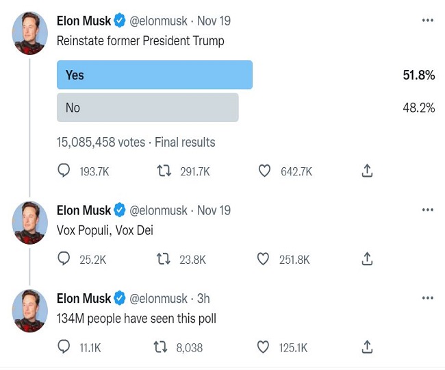 एलन मस्क ने 19 नवंबर को एक पोल डाला था, जिसमें यूजर्स से पूछा गया था कि ट्रंप का अकाउंट बहाल करना चाहिए यह नहीं। इस पर 51.8 फीसद यूजर्स ने अकाउंट बहाल करने के पक्ष में वोट दिया , जबकि 48.2 फीसद यूजर्स ने अकाउंट बहाल न करने के पक्ष में मतदान किया। इस पोल में कुल 1,50,85,458 लोगों ने हिस्सा लिया। वहीं, 135 मिलियन से अधिक लोगों ने पोल को देखा।