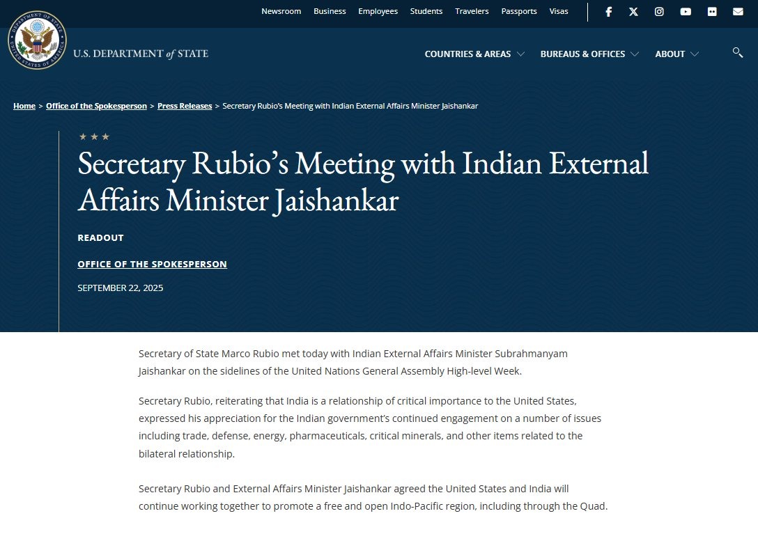 जयशंकर ने भी X पर इस मुलाकात को रचनात्मक बताते हुए कहा, "न्यूयॉर्क में मार्को रुबियो से मुलाकात अच्छी रही। हमने द्विपक्षीय और अंतरराष्ट्रीय मुद्दों पर चर्चा की और प्राथमिकता वाले क्षेत्रों में प्रगति के लिए निरंतर संपर्क की अहमियत पर सहमति जताई।"