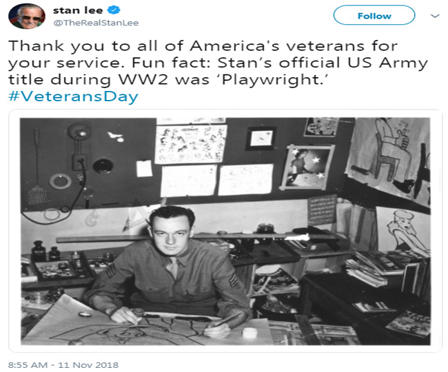 अमेरिका में प्रत्येक वर्ष 11 नवंबर को सेना और शस्त्र बलों के के सेवानिवृत्त जवानों और अधिकारियों के सम्मान में वेटेरनस डे मनाया जाता है। अमेरिका में इस दिन सार्वजनिक अवकाश रहता है। स्टेन ली खुद भी पूर्व में सेना में काम कर चुके थे, लिहाजा उनके दिल में सेना के प्रति विशेष सम्मान होना स्वाभाविक है। स्टेन ली ने अपना आखिरी ट्वीट अपनी मौत से ठीक एक दिन पहले वेटरनस डे से संबंधित किया था। अपने इस ट्वीट में उन्होंने सेना के दौरान की अपनी फोटो के साथ वेटरनस डे की बधाई देते हुए लिखा है, ‘अमेरिका के सभी पूर्व सैनिकों का उनकी सेवाओं के लिए शुक्रिया। दिलचस्प तथ्यः द्वितीय विश्व युद्ध के दौरान स्टेन का यूएस आर्मी टाइटल प्ले राइटर था।’