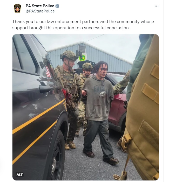 पेंसिल्वेनिया राज्य पुलिस के लेफ्टिनेंट कर्नल जॉर्ज बिवेन्स ने चेस्टर काउंटी में संवाददाताओं को जानकारी दी कि जब हत्यारे को पकड़ने की कोशिश की जा रही थी तो वो चोरी की गई राइफल के साथ झाड़ियों के बीच से भागने की कोशिश कर रहा था और उसने आत्मसमर्पण करने से इनकार कर दिया। जिसके बाद डॉग स्क्वायड टीम K9 को उसे पकड़ने के लिए भेजा गया।