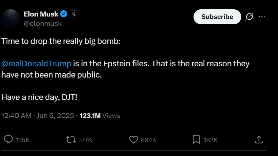 टेस्ला और स्पेसएक्स सीईओ एलन मस्क ने अमेरिका के राष्ट्रपति डोनाल्ड ट्रंप को लेकर बड़ा खुलासा किया है और अपने एक्स पोस्ट पर एपस्टीन फाइलों का जिक्र कर नया बम फोड़ा है। एपस्टीन एक अमीर कारोबारी था जिस पर कई संगीन आरोप लगे थे। 2019 में उसे गिरफ्तार किया गया था और जेल में ही उसकी मौत हो गई थी।