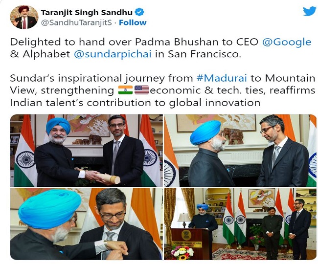 इस मौके पर अमेरिका में भारतीय राजदूत तरणजीत एस संधू ने कहा कि गूगल के सीईओ सुंदर पिचाई को पद्म भूषण सौंपकर खुशी हुई। मदुरै से माउंटेन व्यू तक की उनकी प्रेरणादायक यात्रा, भारत-अमेरिका आर्थिक और तकनीकी को मजबूत करती है। संबंधों, वैश्विक नवाचार में भारतीय प्रतिभा के योगदान की पुष्टि करता है।