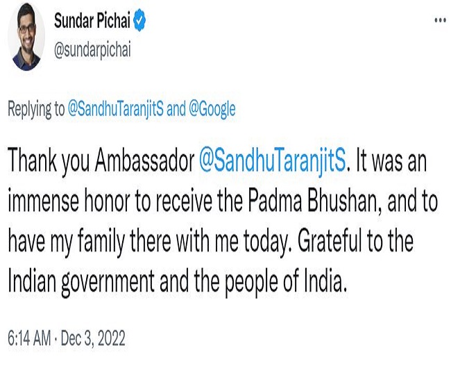 पिचाई ने कहा, मैं इस अपार सम्मान के लिए भारत सरकार और भारत के लोगों का बहुत आभारी हूं। भारत मेरा एक हिस्सा है, और मैं गूगल और भारत के बीच महान साझेदारी को जारी रखने की उम्मीद करता हूं, क्योंकि हम प्रौद्योगिकी के लाभ लाने के लिए मिलकर काम करते हैं।