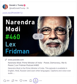 डिजिटल डेस्क, नई दिल्ली। प्रधानमंत्री नरेंद्र मोदी (PM Modi Podcast) ने हाल ही में मशहूर पॉडकास्टर और AI रिसर्चर लेक्स फ्रिडमैन के साथ बातचीत की। प्रधानमंत्री नरेंद्र मोदी के इंटरव्यू को अमेरिकी राष्ट्रपति डोनाल्ड ट्रंप ने अपने निजी सोशल मीडिया अकाउंट ट्रूथ पर शेयर किया है।