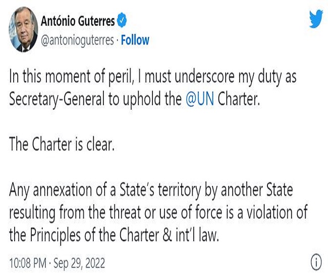 संयुक्त राष्ट्र महासचिव एंटोनियो गुटेरेस ने कहा कि क्रेमलिन द्वारा शुक्रवार को यूक्रेन के चार हिस्सों पर कब्जा करने की घोषणा के बाद धमकी या बल प्रयोग के परिणामस्वरूप किसी अन्य राज्य द्वारा किसी राज्य के क्षेत्र पर कब्जा करना संयुक्त राष्ट्र चार्टर और अंतरराष्ट्रीय कानून का उल्लंघन है।