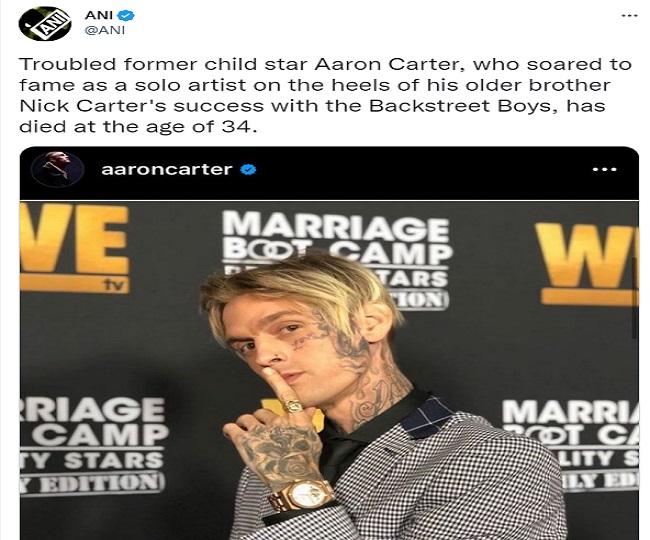 कैलिफोर्निया, एजेंसी। सिंगर और रैपर आरोन कार्टर (Aaron Carter) का 34 साल की उम्र में निधन हो गया है। सिंगर और रैपर आरोन कार्टर, निक कार्टर के छोटे भाई थे। जानकारी के अनुसार, सिंगर और रैपर आरोन कार्टर शनिवार को दक्षिणी कैलिफोर्निया में अपने घर पर मृत मिले थे।