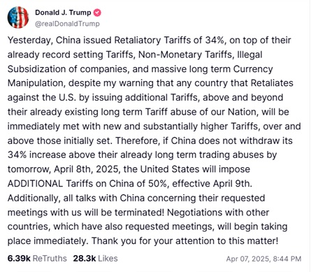 ट्रंप ने कहा,"मैंने चेतावनी दी थी कि कोई भी देश जो हमारे देश के मौजूदा दीर्घकालिक टैरिफ दुरुपयोग से परे अतिरिक्त टैरिफ जारी करके अमेरिका के खिलाफ जवाबी कार्रवाई करेगा, उसे तुरंत नए और काफी अधिक टैरिफ का सामना करना पड़ेगा, जो शुरू में निर्धारित टैरिफ से अधिक होंगे। इसलिए, यदि चीन कल, 8 अप्रैल, 2025 तक अपने पहले से ही दीर्घकालिक व्यापार दुरुपयोगों पर 34% की वृद्धि को वापस नहीं लेता है, तो संयुक्त राज्य अमेरिका 9 अप्रैल से प्रभावी रूप से चीन पर 50% का अतिरिक्त टैरिफ लगाएगा। सके अतिरिक्त, हमारे साथ उनकी अनुरोधित बैठकों के संबंध में चीन के साथ सभी वार्ता समाप्त कर दी जाएगी! लेकिन, चीन ने अमेरिका पर लगाए रिकॉर्ड टैरिफ जारी रखा।"