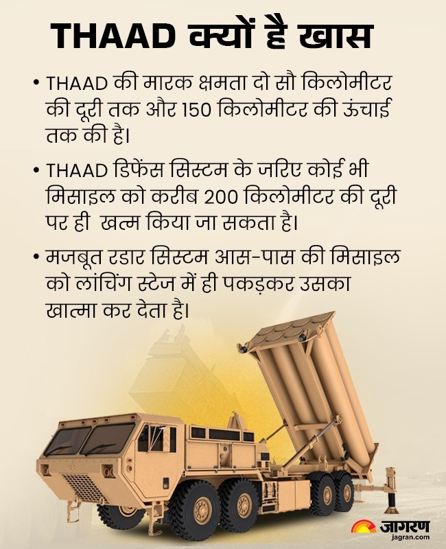- THAAD डिफेंस सिस्टम के जरिए कोई भी मिसाइल को करीब 200 किलोमीटर की दूरी और 150 किलोमीटर की ऊंचाई पर ही खत्म किया जा सकता है।