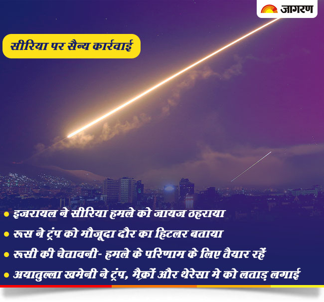 रूस, चीन और ईरान ने हमले पर विरोध जताया है, तो सऊदी अरब और तुर्की समेत दुनिया के ज्यादातर देशों ने कार्रवाई का समर्थन किया है। राजधानी दमिश्क के नजदीक विद्रोहियों के कब्जे वाले घौटा इलाके में असद की फौजों के रासायनिक हमले से हालात बिगड़े। सात अप्रैल को 70 नागरिकों की मौत के बाद ट्रंप ने जवाबी कार्रवाई की घोषणा की। घोषणा के 48 घंटे के भीतर शनिवार तड़के अमेरिका, ब्रिटेन और फ्रांस ने दमिश्क और होम्स पर मिसाइलों की बरसात कर दी। इसमें वैज्ञानिक शोध केंद्र, उत्पादन इकाई और भंडार गृह को खासतौर पर निशाना बनाया गया।
