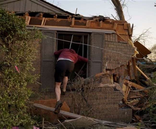 अमेरिका के दक्षिणी और मध्य पश्चिमी हिस्से में शुक्रवार को उठे एक बवंडर ने भारी तबाही मचाई है। अरकंसास में कई घर और शॉपिंग सेंटर क्षतिग्रस्त हो गए और इलिनोइस में एक कंसर्ट के दौरान थिएटर की छत ध्वस्त हो गई। Photo- AP