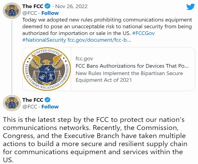 FCC ने कहा, 'संघीय संचार आयोग ने संयुक्त राज्य अमेरिका में आयात या बिक्री के लिए अधिकृत होने से राष्ट्रीय सुरक्षा के लिए अस्वीकार्य जोखिम पैदा करने वाले संचार उपकरणों को प्रतिबंधित करने वाले नए नियमों को अपनाया। यह हमारे देश के संचार नेटवर्क की सुरक्षा के लिए आयोग का नवीनतम कदम है। हाल के वर्षों में, आयोग, कांग्रेस और कार्यकारी शाखा ने संयुक्त राज्य के भीतर संचार उपकरणों और सेवाओं के लिए एक अधिक सुरक्षित और लचीला आपूर्ति श्रृंखला बनाने के लिए कई कदम उठाए हैं।'