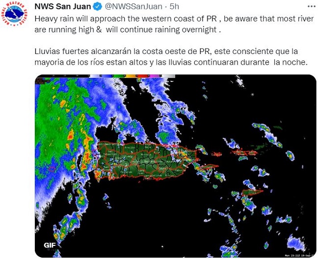 राष्ट्रीय मौसम सेवा कार्यालय ने कहा प्यूर्टो रिको के पश्चिमी तट पर भारी बारिश होने की संभावना है। अधिकांश नदियां उफान पर है और रात भर बारिश जारी रहेगी।