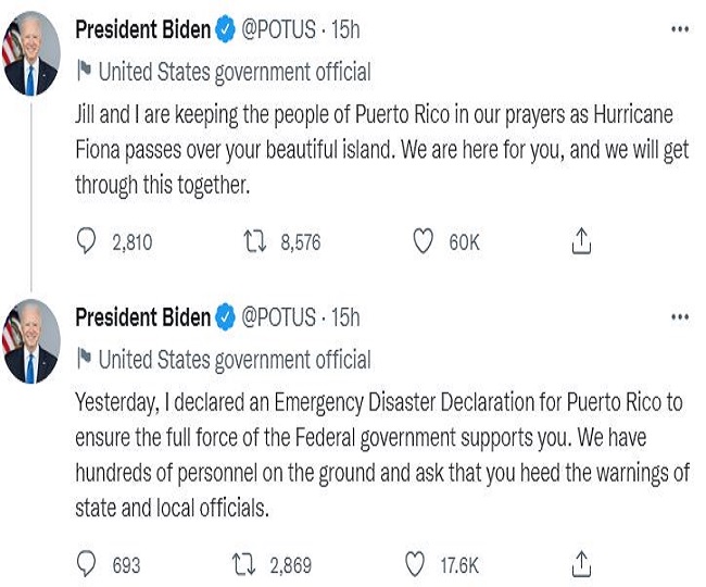 अमेरिकी राष्ट्रपति जो बाइडेन ने रविवार को पुर्तो रिको के लिए एक आपातकालीन की घोषणा की थी। उन्होंने संघीय आपात प्रबंधन एजेंसी को आपदा राहत प्रयासों में समन्वय स्थापित करने और आपातकालीन सुरक्षात्मक उपाय प्रदान करने के आदेश दिए।