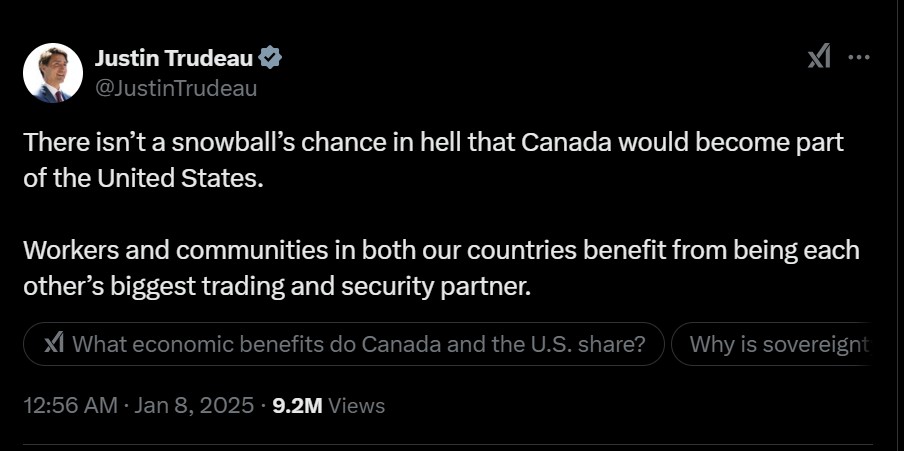 ऐसा होना बिल्कुल भी मुमकिन नहीं है कि कनाडा अमेरिका का हिस्सा बनेगा। दोनों देशों के श्रमिक व अन्य समुदाय कनाडा और अमेरिका एक-दूसरे के सबसे बड़े व्यापारिक और सुरक्षा साझेदार होने से लाभान्वित होते हैं। - जस्टिन ट्रूडो, प्रधानमंत्री, कनाडा