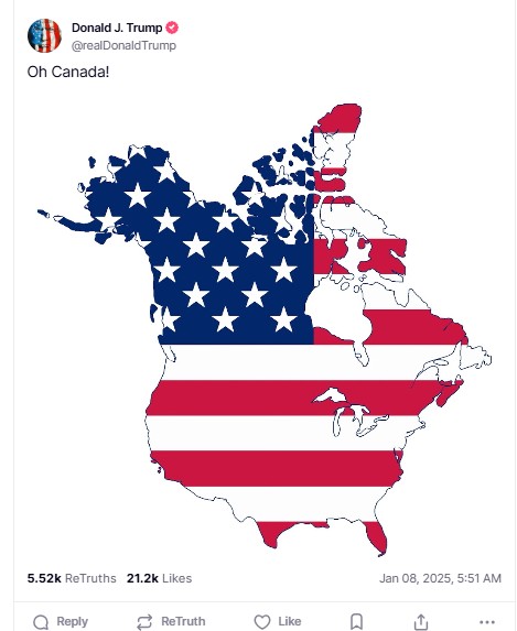 क्रिसमस के बधाई संदेश में वह कनाडा को अमेरिका का 51वां राज्य और ट्रूडो को कनाडा का गर्वनर भी बता चुके हैं। इसके अगले दिन ट्रंप ने लिखा- कनाडा के गवर्नर जस्टिन ट्रूडो के नागरिकों को बहुत ज्यादा टैक्स पे करना पड़ रहा है।