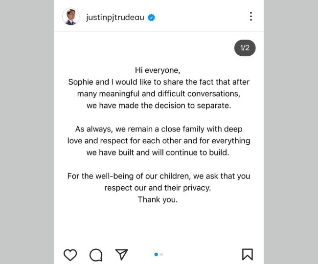 जस्टिन ट्रूडो और सोफी ने इंस्टाग्राम पर पोस्ट किए गए बयानों में कहा कि उन्होंने लंबी बातचीत के बाद अलग होने का फैसला लिया है। इसके अलावा प्रधानमंत्री कार्यालय की ओर से जारी एक बयान में कहा गया है कि दोनों ने लीगल सेपरेशन एग्रीमेंट पर साइन किए हैं।
