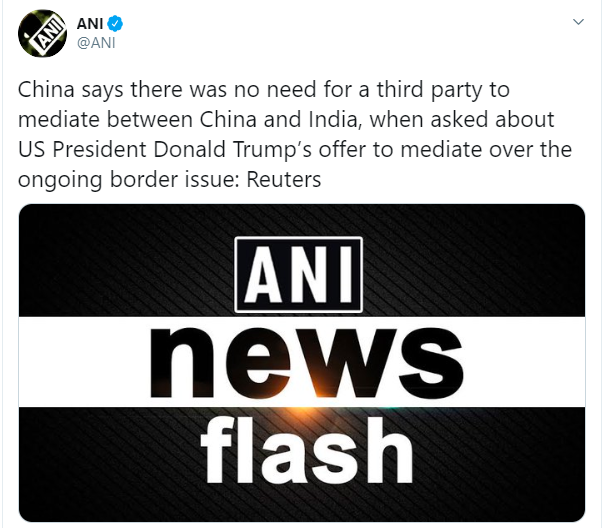 ट्रंप ने ट्वीट करके कहा था कि हमने भारत व चीन को सूचित किया है कि अमेरिका उनके सीमा विवाद को सुलझाने व उसमें मध्यस्थता करने को तैयार है व सक्षम है। भारत ने मध्यस्थता की पेशकश को पहले ही ठुकरा दिया। इसके बाद अब चीन ने भी इस पेशकश को ठुकरा दिया है। दोनों देशों का कहना है कि इस सीमा विवाद को बातचीत के जरिए से सुलझा लिया जाएगा।
