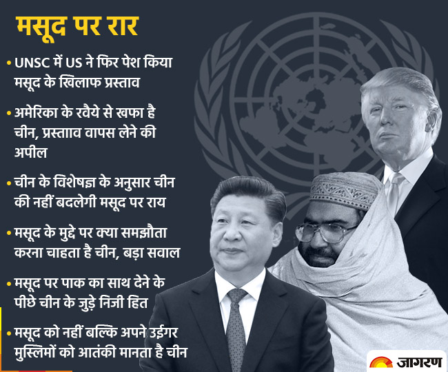 नई दिल्ली [जागरण स्पेशल]। पाकिस्तान में बैठे आतंकी मसूद अजहर पर पिछले एक माह से रार थमने का नाम नहीं ले रही है। इसके दो पहलू हैं। एक पहलू में भारत, अमेरिका, फ्रांस और ब्रिटेन हैं तो दूसरे पहलू पर चीन और पाकिस्तान हैं। पाकिस्तान चीन के जरिए आज तक इस आतंकी को बचाता आया है। पिछले ही दिनों चीन ने फ्रांस, जर्मनी और ब्रिटेन द्वारा लाए गए प्रस्ताव पर वीटो का इस्तेमाल करते हुए इसको गिरा दिया था। वहीं अब अमेरिका ने संयुक्त राष्ट्र सुरक्षा परिषद में मसूद के खिलाफ सीधा प्रस्ताव पेश कर दिया है, जिससे चीन चिढ़ गया है। अमेरिका की बात करें तो उसका कहना है कि चीन अपने यहां के मुसलमानों को आतंकी बताकर जेल में ठूंस रहा है और मसूद को बचाने में कोई कोर-कसर नहीं छोड़ रहा है। चीन की वजह से ही मसूद 2007, 2016, 2017 और फिर 2019 में वैश्विक आतंकी घोषित नहीं हो सका है। लेकिन चीन के रुख से बार-बार एक सवाल जरूर खड़ा होता है कि आखिर यह आतंकी चीन का इतना चहेता क्यों है। इसको समझना बेहद जरूरी है।