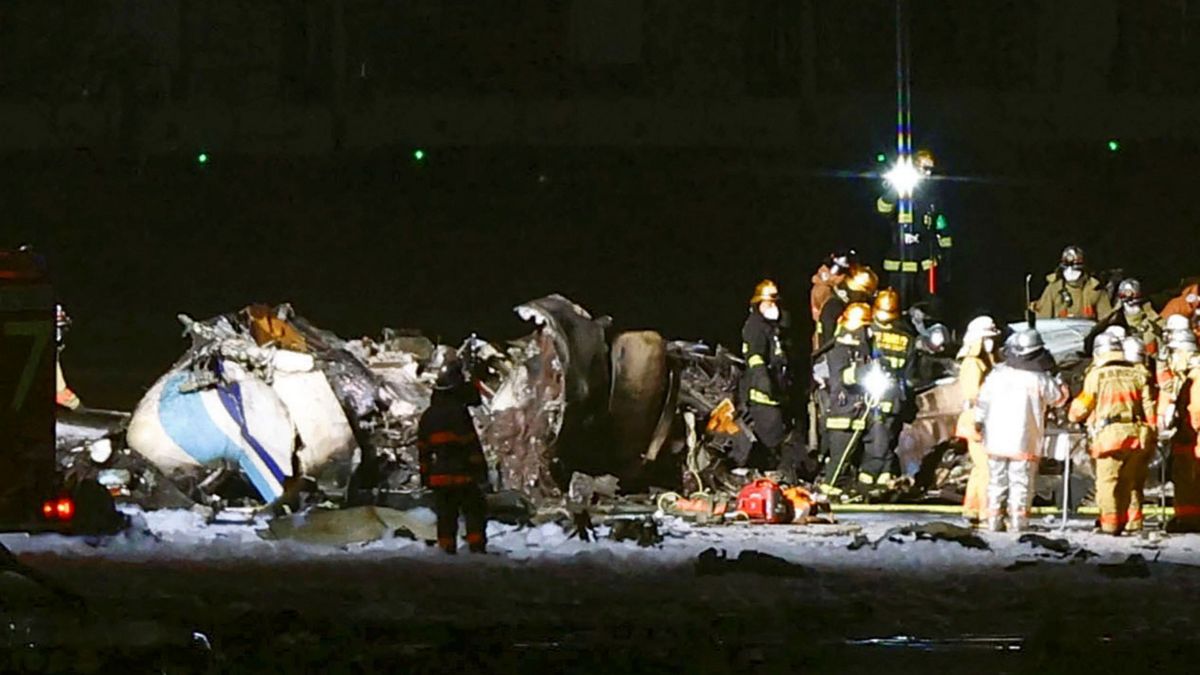 टोक्यो के हानेडा हवाई अड्डे पर जले हुए जापान एयरलाइंस के विमान के मलबे के पास अग्निशामक कर्मी तैनात हैं।