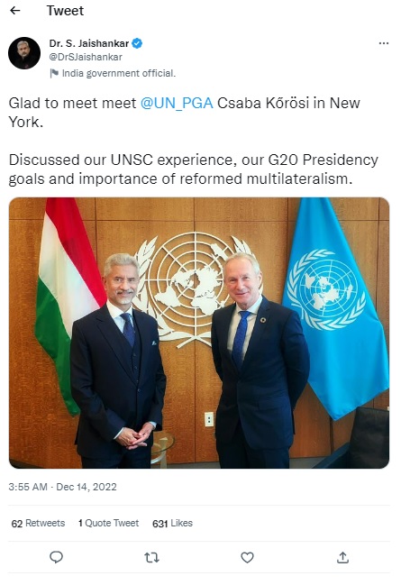 विदेश मंत्री जयशंकर ने न्यूयॉर्क में संयुक्त राष्ट्र महासभा के अध्यक्ष साबा कोरोसी से भी मुलाकात की। इस दौरान भारत के जी-20 अध्यक्षता लक्ष्यों और बहुपक्षवाद में सुधार के महत्व पर चर्ची की गई। अपने एक ट्वीट में जयशंकर ने कहा, न्यूयॉर्क में संयुक्त राष्ट्र महासभा के अध्यक्ष से मिलकर खुशी हुई। यूएनएससी अनुभव, हमारे जी-20 प्रेसीडेंसी लक्ष्यों और बहुपक्षवाद के महत्व पर चर्चा की।