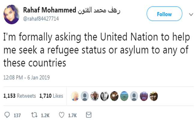 रहाफ ने रविवार और सोमवार को एक के बाद एक कई ट्वीट किए थे और मदद की गुजारिश की थी। साथ ही उसने ट्विटर के जरिए संयुक्त राष्ट्र से भी मदद की अपील की थी। उसने संयुक्त राष्ट्र से शरण की अपील भी की थी। युवती फोन के जरिए वह कई वकीलों, मीडिया संस्थानों और समाज सेवी संस्थाओं के संपर्क में थी। काफी प्रयास के बाद करीब 48 घंटों की जद्दोजहद के बाद संयुक्त राष्ट्र ने उसे शरण देने की स्वीकृति दे दी है।