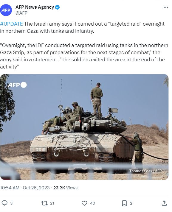 गाजा की सीमा पर इजरायल के हजारों सैनिक टैंक के साथ तैनात हैं। बुधवार को इजरायल के प्रधानमंत्री बेंजामिन नेतन्याहू ने कहा कि इजरायल जमीनी घुसपैठ की तैयारी कर रहा है। उन्होंने यह बताने से इनकार कर दिया कि यह कब शुरू होगा। लेकिन इस बयान के बाद ही बुधवार देर रात इजरायल के सैनिक भारी मात्रा में गाजा में घुसकर भयानक तबाही मचाई है। बुधवार के घुसहपैठ में इजरायल की सेना ने हमास आतंकियों के ठिकाओं के साथ-साथ कई इमारतों को भी तबाह कर दिया। अमेरिका और अन्य अधिकारियों को डर है कि लड़ाई व्यापक क्षेत्रीय संघर्ष में बदल सकती है।