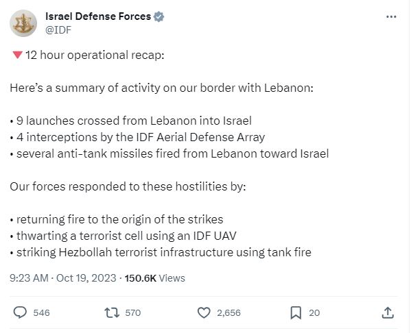 इजरायल की सेना (आईडीएफ) ने एक्स पर ट्वीट कर पिछले 24 घंटों में लेबनान ने क्या किया और इजरायल ने उसका जवाब कैसे दिया इसके बारे में जानकारी दी है।