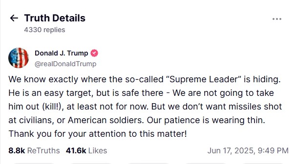 सुप्रीम लीडर का ये बयान तब आया है जब अमेरिकी राष्ट्रपति ने उनके बारे में छिपे होने की बात कही है। दरअसल ट्रंप ने अपने सोशल मीडिया प्लेटफॉर्म ट्रूथ पर पोस्ट कर कहा, हम अच्छी तरह जानते हैं कि तथाकथित सुप्रीम लीडर कहां छिपे हैं। वह एक आसान टारगेट हैं, लेकिन फिलहाल वह सुरक्षित हैं।"