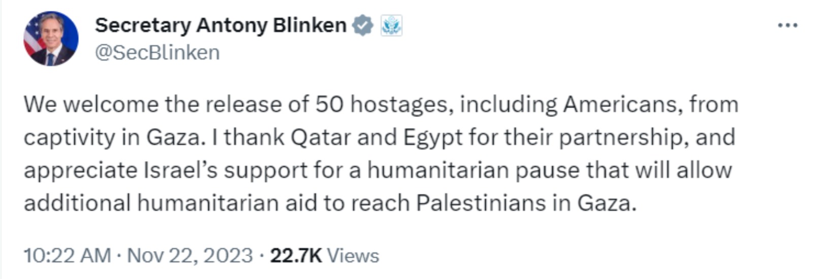 अमेरिका ने 50 बंधकों की रिहाई का स्वागत किया है। अमेरिकी सचिव एंटनी ब्लिंकन ने इस डील के पीछे कतर और मिस्र की साझेदारी का भी स्वागत किया है। उन्होंने X(पूर्व में ट्विटर) पर पोस्ट लिखा, 'हम गाजा में कैद से अमेरिकियों सहित 50 बंधकों की रिहाई का स्वागत करते हैं। कतर और मिस्र को उनकी साझेदारी के लिए धन्यवाद देता हूं और मानवीय विराम के लिए इजरायल के समर्थन की सराहना करता हूं जो गाजा में फिलिस्तीनियों तक अतिरिक्त मानवीय सहायता पहुंचाने की अनुमति देगा'