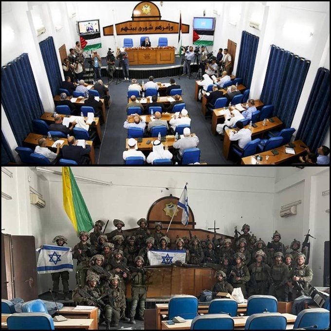 सोशल मीडिया पर इजरायली सेना ने एक फोटो साझा किया है, जिसमें देखा जा सकता है कि आईडीएफ के गोलानी ब्रिगेड गाजा में मौजूद हमास के संसद भवन (Hamas Parliament) के अंदर मौजूद हैं और वे अपने देश का झंडा लहरा रहे हैं। तस्वीर में देखा जा सकता है कि इजरायली सैनिक संसद की स्पीकर की कुर्सी पर बैठे हैं।