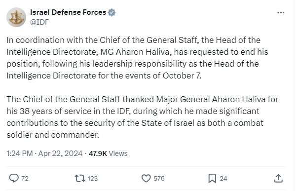 इजरायल और हमास के बीच पिछले साल अक्टूबर में जंग की शुरुआत हुई थी। सात अक्टूबर को जब हमास ने इजरायल पर हमला किया था तब इजरायल ने मुहतोड़ जवाब देने में असफल रहा। इस विफलता की जिम्मेदारी इजरायल के सैन्य खुफिया प्रमुख अहरोन हलीवा ने ली थी। वहीं अब इजरायल के सैन्य खुफिया प्रमुख ने इस विफलता पर अपना इस्तीफा दे दिया है।