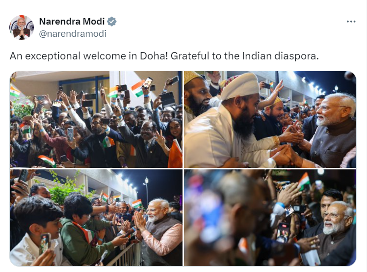 वहीं, पीएम मोदी ने दोहा पहुंचने के बाद भारतीयों का स्वागत किया। पीएम मोदी ने एक्स पर लिखा- 'दोहा में खास स्वागत के लिए मैं भारतीय प्रवासियों का आभारी हूं।'