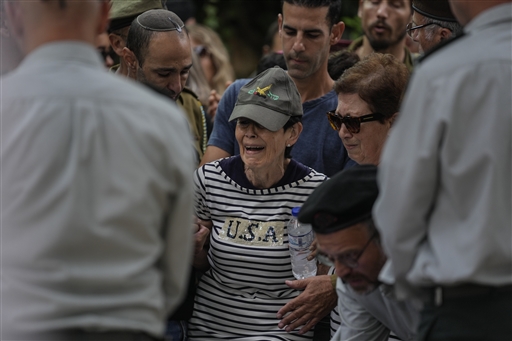 सोमवार को इजरायल के तेल अवीव में सैन्य कब्रिस्तान में अंतिम संस्कार के दौरान दोस्त और रिश्तेदार कब्र के पास शोक मनाते हुए।
