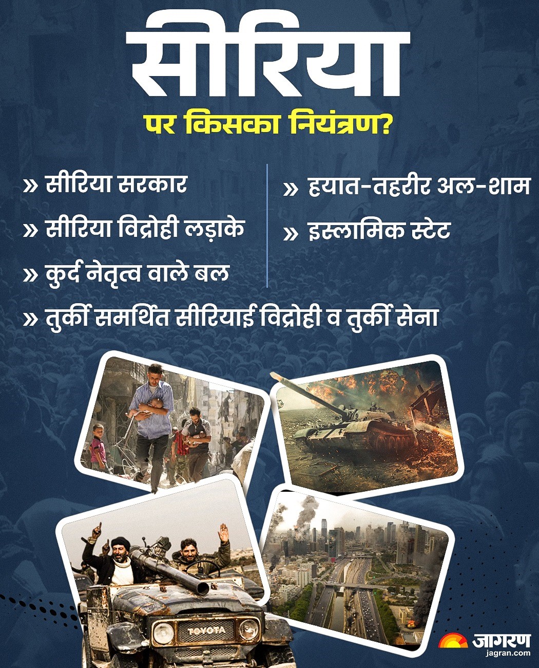 - 2020 - असद शासन ने अधिकांश क्षेत्र और सभी मुख्य शहरों पर कब्जा कर लिया। विद्रोहियों ने उत्तर-पश्चिम पर कब्जा कर लिया। तुर्किये समर्थित सेना ने सीमा पट्टी पर कब्जा कर लिया। कुर्द नेतृत्व वाली सेना ने उत्तर-पूर्व पर नियंत्रण कर लिया।
